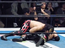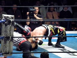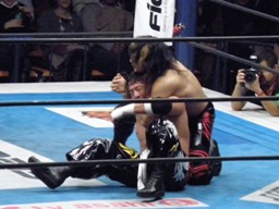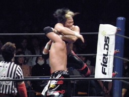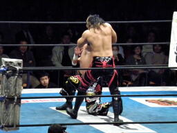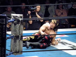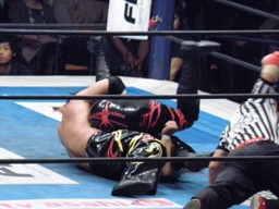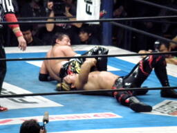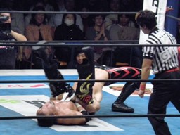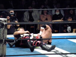 TAJIRI十字に切り返し、キーロックに移行(右写真)、前転して絞る。棚橋ブレークするとヘッドロック、TAJIRIエビ固めに、カウント1。5分経過。