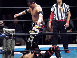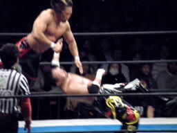 TAJIRIボディスラム、腹を踏む(右写真)とその場跳びムーンサルトプレス、カウント2。