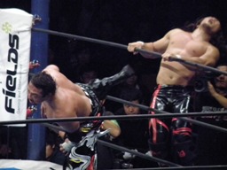 棚橋低空ドロップキック、コーナーに振って突っ込む、TAJIRIかわして棚橋エプロンに。そこにTAJIRIトラースキック(左写真)、棚橋場外転落。
