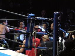 TAJIRIはセコンドの外道になにやら耳打ち(左写真)。