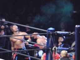 棚橋ヘッドロック、TAJIRIロープに振る、棚橋ショルダーブロック、TAJIRIは場外エスケープ。カウント6で一旦リングに戻るがまた場外に。あからさまな動きだが観客のいら立ちを誘う。TAJIRIリングに戻ると手四つ(左写真)。