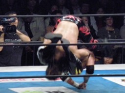 棚橋引き起こすとTAJIRIはモンキーフリップ、ダブルブリッジの形になるが棚橋はダブルのリストロック、TAJIRI回転して切り返す(左写真)。