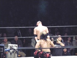 両者ヒザ立ちで張り手の打ち合い(右写真)、TAJIRI立ち上がってドロップキック。