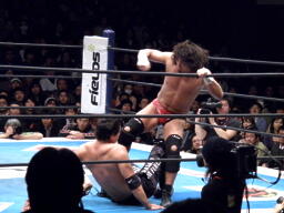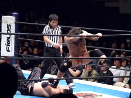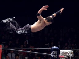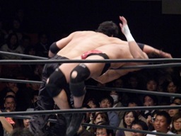 AKIRAコーナーに上ってムササビボディプレス(右写真)2連発、しかし2発目はYAMATOがヒザを立ててブロック。