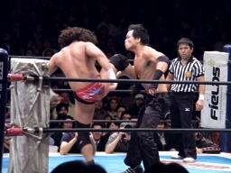 エルボーの打ち合い、YAMATOガットショット(左写真)、ロープに飛ぶ、AKIRA延髄蹴り。
