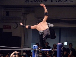 YAMATO「俺も飛ぶぞー!」と宣言してよろよろとコーナーに上る、AKIRA起き上がって下からドロップキック(右写真)。