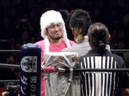 ディーノが新日のリングに!パンダ帽は観客から奪ったもの(右写真)。
