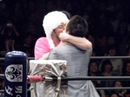 邪道再度ビューティフルパントキック、ディーノかわしてスクールボーイ、カウント2。ディーノキス、邪道振り払う、ディーノ再度キス、邪道振り払う、ディーノ捕まえてディープキス(右写真)。