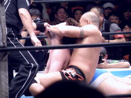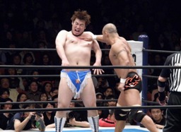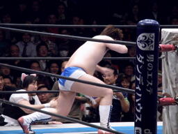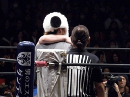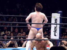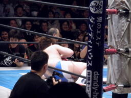 ディーノスイちん、キャメルクラッチの体勢からタイツを下ろして外道クラッチ(左写真)、カウント3。