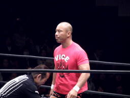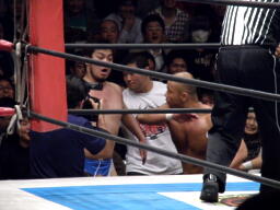 邪道はエプロンに上がってきたディーノに逆水平(左写真)、ディーノロープをつかんで踏みとどまる。