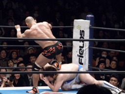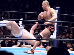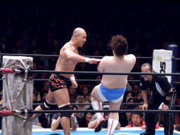 邪道「ファイトー」で首投げ、「いっぱーつ!」でサッカーボールキック(右写真)。