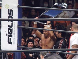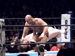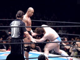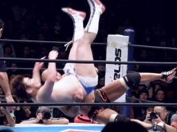 ディーノブレークしてロープに飛ぶ、邪道カウンターのエルボー(右写真)。5分経過。