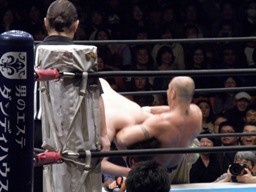 場外で逆水平(右写真)、ディーノは最前列の客に抱きつく。ディーノペースだ。邪道放送席近くで逆水平、タイガーが逃げてディーノは解説の柴田さんに抱きつく。
