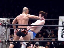 ディーノ股間にタッチ、邪道無視して逆水平(左写真)。