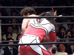 ロックアップ、丸藤ヘッドロック(右写真)、ライガーロープに振る、丸藤ショルダーブロック。