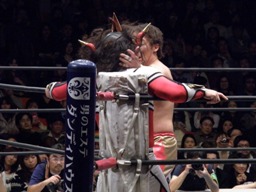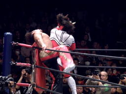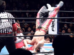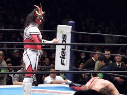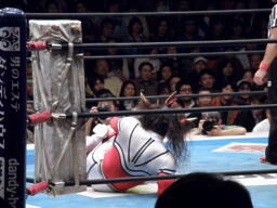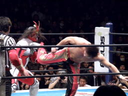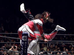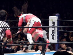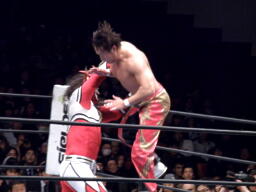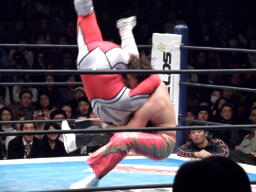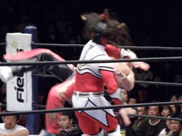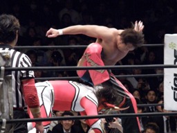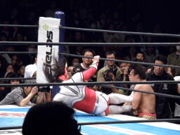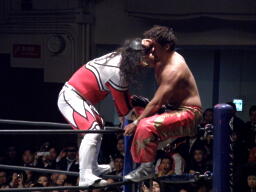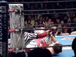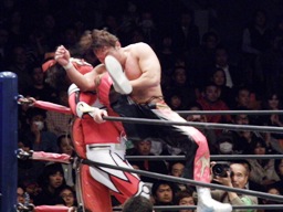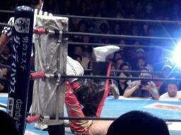 丸藤首投げ、ロープに飛んでトップロープを飛び越すとブーメラン式ドロップキック。丸藤フェースロック、両足で顔面ひねり。コーナーに詰めてエルボー(右写真)、対角線コーナーに振る、ライガー切り返し丸藤コーナーに上ってキック。