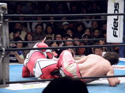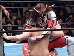 丸藤ヨーロピアンサイドヘッドロック(左写真)、ライガーがパンチでブレークしようとするたび一旦外して元の体勢に戻す。5分経過。