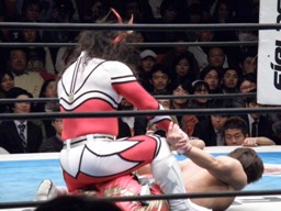 丸藤腕を取ると腕折り(右写真)、ライガーカニばさみで倒す。