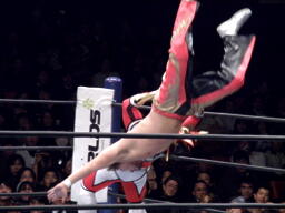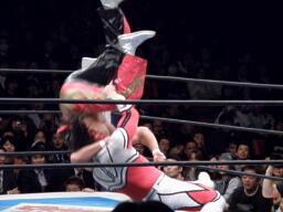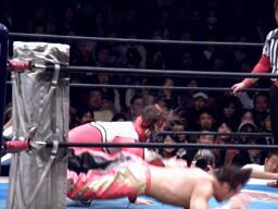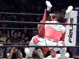 丸藤もコーナーに上る、ライガーはマットに降りて丸藤を持ち上げるとサンダーライガーボムに(左写真)、カウント2。