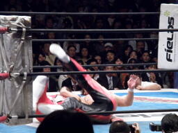 丸藤ロープに飛ぶ、ライガーカウンターのテーズプレス(左写真)、カウント2。