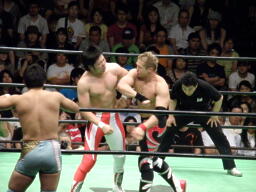 宮原ビッグブーツ、中嶋を呼び込む。ダブルのクローズラインはかわされるが宮原が抱え上げて中嶋がカッター(右写真)、4人とも場外に出て乱闘。