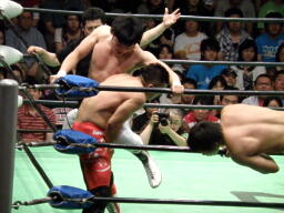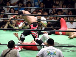 リリースしてコーナーに上るとフロッグスプラッシュ(右写真)、カウント2。鼓太郎にタッチ。