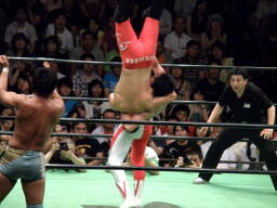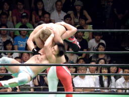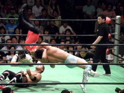 ロックアップ、中嶋ホイップ、ハイキック、金丸かわしてフライングメイヤー(左写真)。両者立ち上がる、中嶋ロープに振る、金丸ショルダーブロック、ロープに飛ぶ。中嶋ドロップキック、金丸スカす。金丸逆にドロップキック。