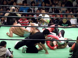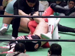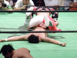 宮原三角絞め、カットに入った金丸を中嶋が押さえる(右写真)、鼓太郎ロープ。