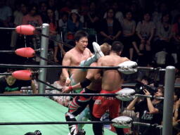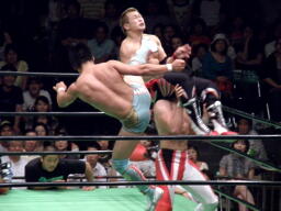 金丸ロープに振ってキック、垂直落下式ブレーンバスター狙うが宮原逆にブレーンバスターで投げ(右写真)中嶋にタッチ。