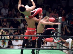 そして金丸をブレーンバスターで鼓太郎に投げつける(右写真)。