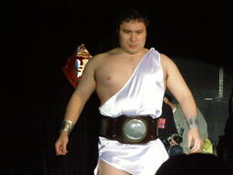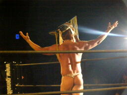 大皇帝三四六が大奴隷ヌルハチを引きずって入場(右写真)。リングに上がるといきなりエプロンに放り出して絞首刑。ひどい。