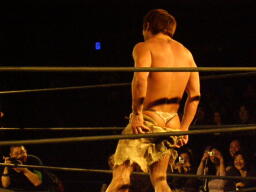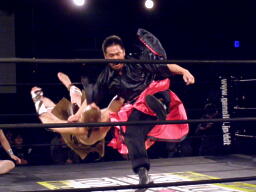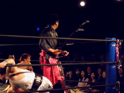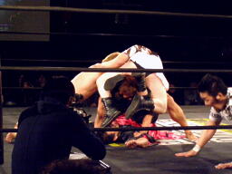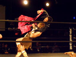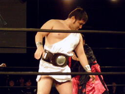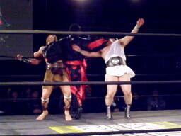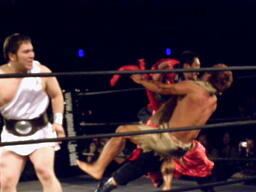 タケダイオスパンチ、ボディスラムから再び十字(右写真)。今度は三四六がカット。5分経過。