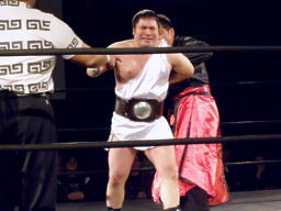 タケダイオスが三四六にトラースキックから古代オリンピックスラム(右写真)。安敦がカバー、ヌルハチがタケダイオスが着けていた鉄球でカット。10分経過。