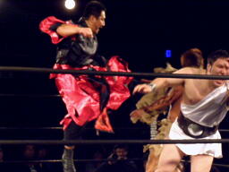 三四六ドラゴンリングインから安敦にドロップキック、安敦はタケダイオスにタッチ。三四六タケダイオスにラリアット(右写真)、ヌルハチを呼び込む。