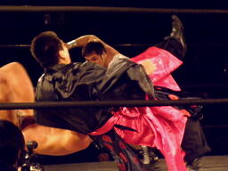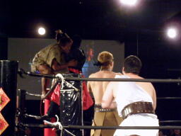 三四六「ヌルハチ、連携、ブレーンバスター。」三四六は雪崩式ブレーンバスター式セントーン狙うがタケダイオスはすでに立ち上がっている(右写真)。