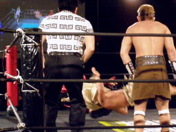 安敦とタケダイオスがダブルで三四六をロープに振ってクローズライン、三四六かわして逆に2人にクローズライン(左写真)。