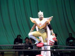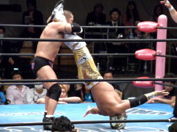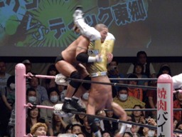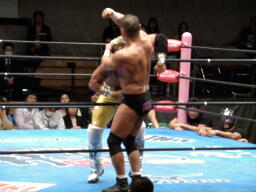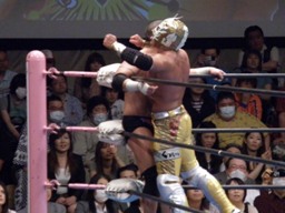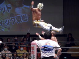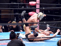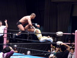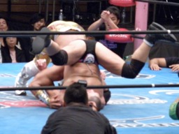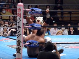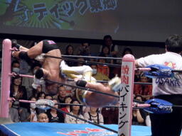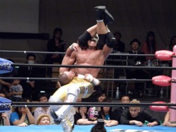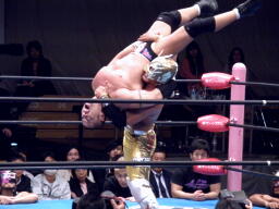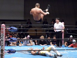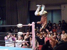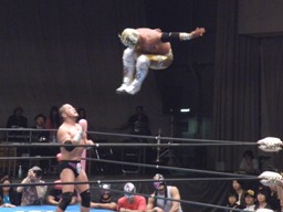 ビリーコーナーに上ってウルトラ・ウラカンラナ(右写真)、東郷はパワーボムに切り返す、カウント2。