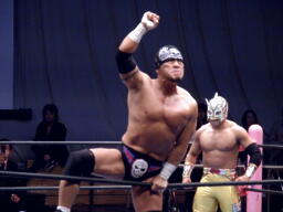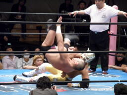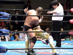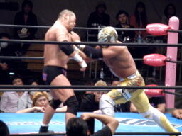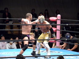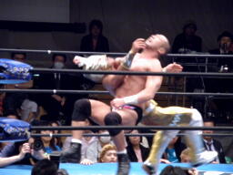 ビリーはベルティゴ狙う、東郷ブロックしてラリアット、ビリーかわしてラ・エスパルダ(左写真)、カウント2。