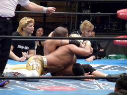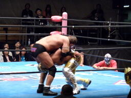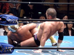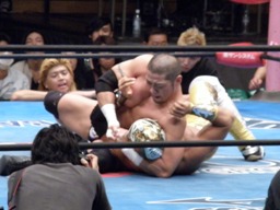 ロックアップ、東郷フライングメイヤーからグラウンドヘッドロック(右写真)、ビリーエビ固めに、カウント2。両者立ち上がる。