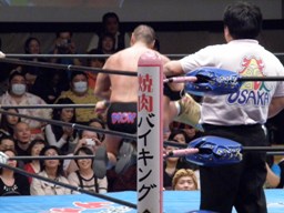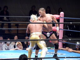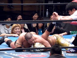 東郷ビリーをエプロンに引っ張り出してペディグリー狙う、ビリーはブロック(左写真)、リバースして東郷をリング下に落とす。10分経過。