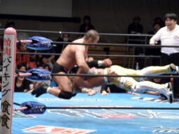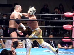 対角線コーナーでもう一発(左写真)、東郷は場外エスケープ。ビリー追う、場外でパンチ、逆水平、客席に振るが東郷切り返しビリーが客席に突っ込む。東郷イス攻撃、リングに戻す。