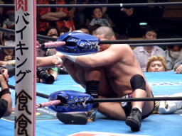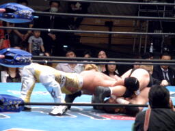 東郷肩に担ぐ、ビリー着地してバック取る、東郷切り返す、足をすくうと急所にダブルフットスタンプ、カウント2。東郷ボディシザーズ(右写真)、ビリーはヒジでブレーク。