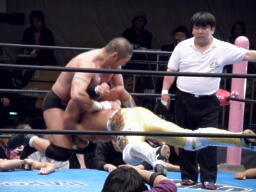 バックの取り合いからビリー東郷の腕を固めてラリアット(右写真)、カウント2。