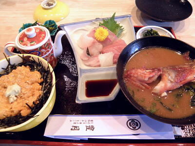 昼食は「ウニのぼっかけ定食」。うにに胡麻だれというのが珍しい。味噌汁はアラカブ。いいもんにありつけたからよしとしよう。
