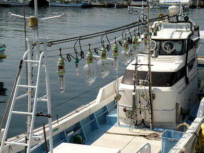 勝本港に。こちらの港にはまだ飯食えるところがいくつかあった。写真はイカ釣り漁船。