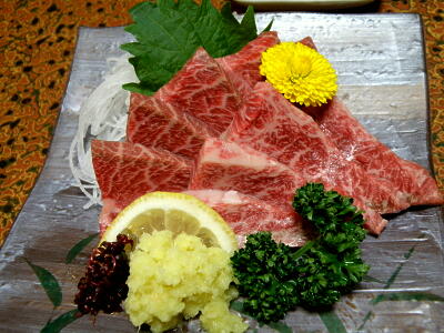 楽しみの夕食。まずは急きょ追加した牛刺し。うまい。