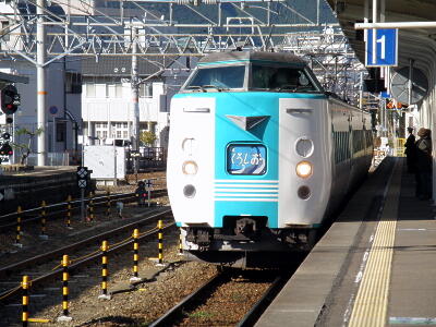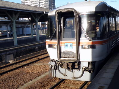 新宮までは特急南紀。駅に着く直前で新宮城の船着場の石垣が鉄橋から見えることに気づく。まだブルーシートかかってるなあ。新宮駅で特急くろしおに乗り換える。モハ381の古い車両。