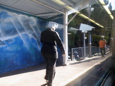 しばらく国盗りもない、と居眠りしてたら周りのざわめきで目が覚める。太地駅。特急停車駅ではない。周りの話(主に子供の母親に対する「なんでー」攻撃とそれに対する答え)を聞いてるとどうも飛び込み自殺があったらしい。あわただしく駅員や警察官がホームを走る。田舎なので野次馬は3人ほど。現場検証、事情聴取のため1時間運転見合わせ。もともと試合開始直前になんばに着く予定にしてたから前半戦見れないことが決定。