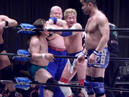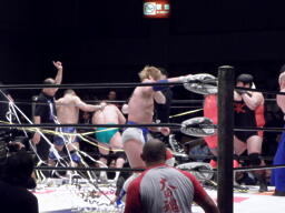 戸口はポイズンを落とそうとする、そこにナウリーダー軍がトリプルドロップキック、ポイズンと戸口が同体で場外転落(左写真)。