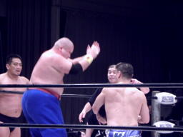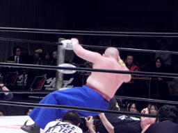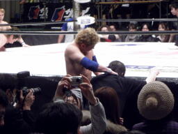 TAKAがスイングDDTを狙う浜田をエプロンに出し(右写真)スーパーKで場外に落とす。
